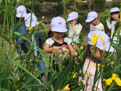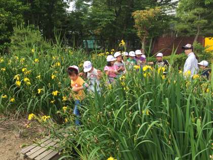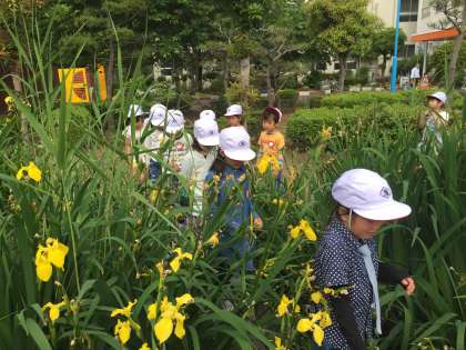 学校には「とんぼ池」というビオトープがあります。池の中にはカエルややご、ざりがになどがいます。きれいに咲いていた菖蒲もおわり、カエルの鳴く季節になっています。1年生は、とんぼ池にかかっている橋を少しこわそうに渡っていました。