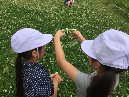 シロツメクサをつないで花飾りができました。テントウムシをつかまえて、お友だちに見せていました。