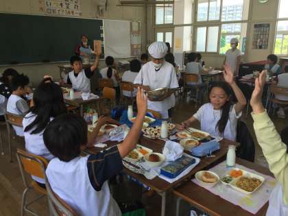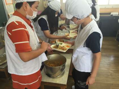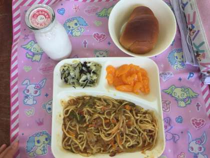 今日の給食は、カレースパゲッティ、キャベツのひじきドレッシング、みかん(缶)でした。量もたっぷりあったカレースパゲッティは、大好評でした。