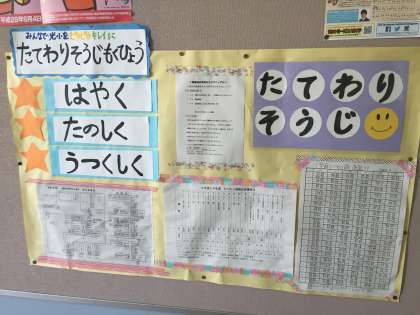 たてわり掃除は、「はやく」「うつくしく」だけでなく「たのしく」が入っています。大切にしているのは、全校の輪です。