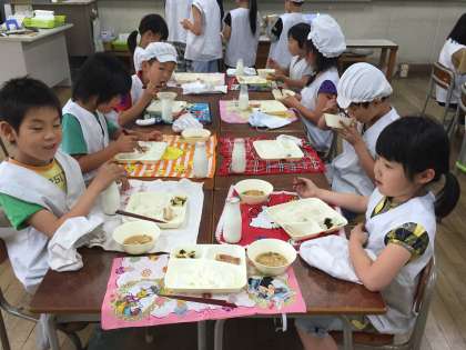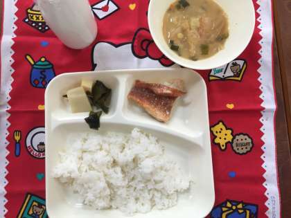 今日の給食は、赤魚の醤油だれかけ、みそ汁、わかたけ煮でした。わかたけ煮は、好評でよく食べていました。