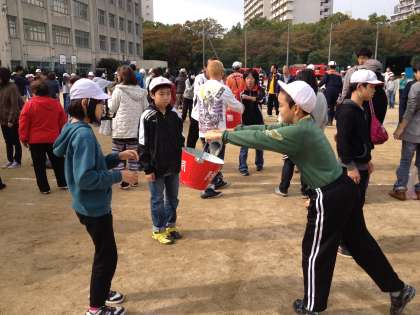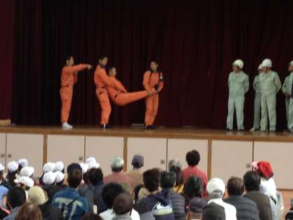 全員が講堂に集まり、けがをした人や車いすにのっている人を搬送する方法を教えていただきました。続いて、水消火器やバケツリレーを地域のみなさんと一緒に行いました。最後には、非常食として備蓄されているアルファ米を炊き出し、みんなで試食しました。「おいしい!」「もっとほしい」という声があがり、ほとんど残すことなく完食しました。町ぐるみで、防災について考えた土曜授業でした。