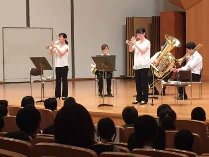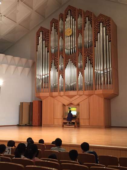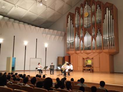今回は金管五重奏とパイプオルガンの調べを鑑賞するプログラムでした。耳慣れた「となりのトトロ」や「ドラえもん」も演奏していただき、子どもたちも大喜びでした。また、重厚なパイプオルガンの響きには、とても驚いていました。最後にはパイプオルガンの伴奏で校歌を歌い、楽しい音楽鑑賞会を締めくくりました。