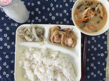 今日は鶏肉の甘辛焼き、みそ汁、キャベツの赤じそあえでした。鶏肉とキャベツのさっぱり感が合って、おいしくいただきました。