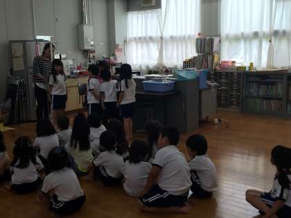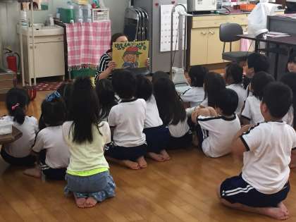 発育測定の前に紙芝居をみました。歯磨きの大切さを保健室でも指導しています。1年生は、入学してから2か月がすぎて、とっても成長しています。