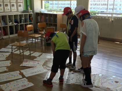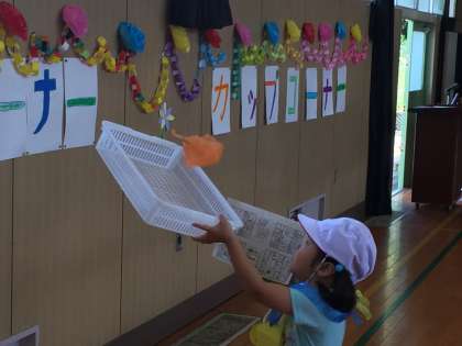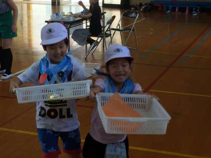 「ヒラヒラ、ヒラリ」と「脱出迷路」が出し物でした。講堂からヒラヒラと落ちてくるティッシュなどを、かごでキャッチするゲームでした。脱出迷路も大人気でした。