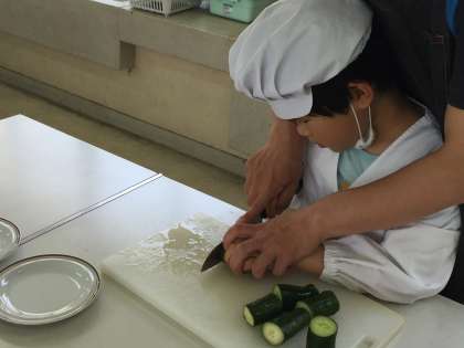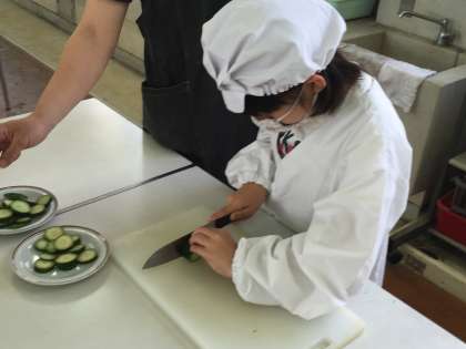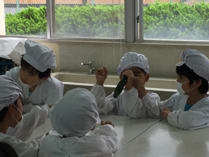 2年生は学習園でできたきゅうりを食べました。まず収穫したきゅうりをさわってみて、包丁で切ってみました。部屋中がきゅうりの香りでいっぱいになりました。