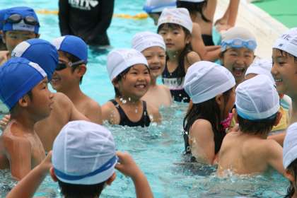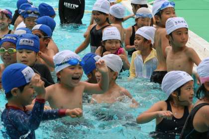 1・2年生は久しぶりのプールでした。前回よりも水の量を多くしました。2年生がやさしくリードしていました。
