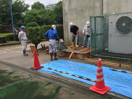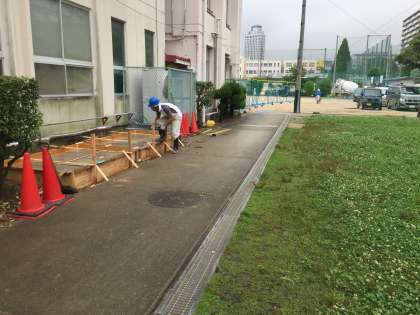 本校はエアコンの室外機を1階に設置します。今は、室外機を置く土台を作っています。これから8月まで工事が続きます。