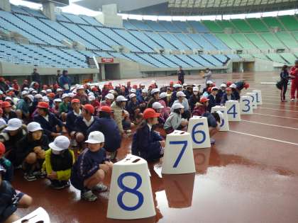午前は、陸上競技場で、100m走、100m×4リレー、800m走に参加する予定でしたが、競技が始まる直前に雨が降ってきましたので、3種目の実施が困難になり、100m走のみの実施となりました。子どもたちは、全力疾走で100m駆け抜けていました。