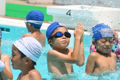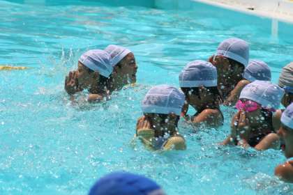 1・2年生はプールで躍動していました。少しくらい顔に水がかかっても、こわがる子はいません。