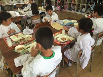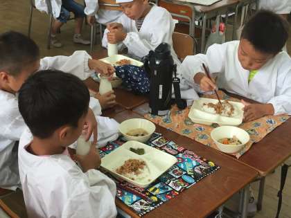 今日の給食は、豚肉とじゃがいもの煮物、オクラの甘酢あえ、紅鮭そぼろでした。子どもたちは、そぼろごはんが好きですから暑さも忘れてごはんを食べていました。