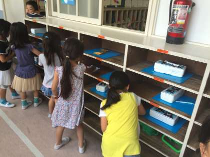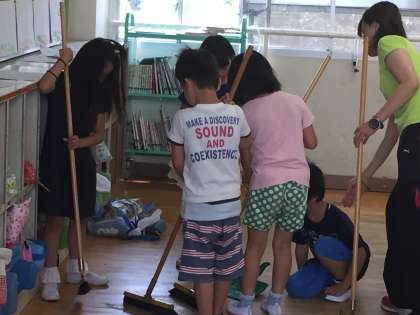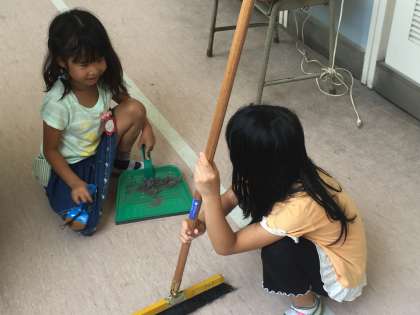 今はたてわり掃除ではなく、学年ごとのそうじになっています。1年生は、自分の教室をていねいにそうじしています。あと少しで夏休みですから、とてもきれいにしています。