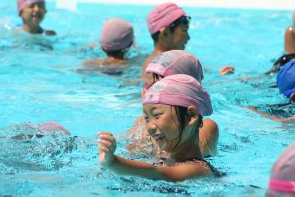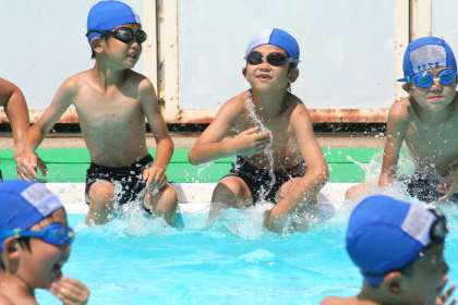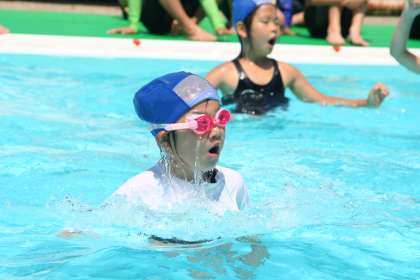 2・3年生は、今日もバタ足の練習です。くりかえすことによって、形ができてきます。