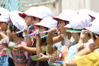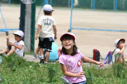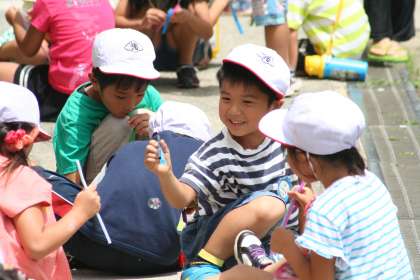 子どもたちの願いをのせたしゃぼんだまは、風にのって高く高く飛んでいきました。