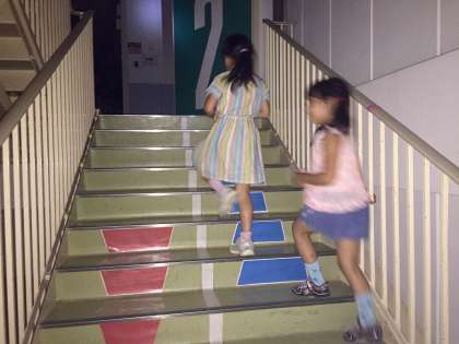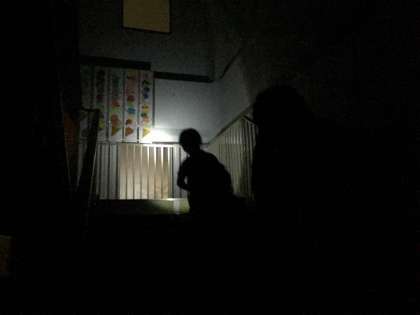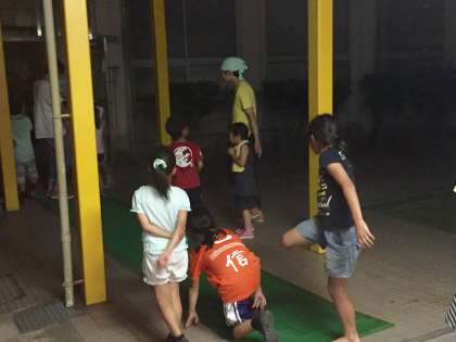 校庭キャンプの夜は、きもだめしで盛り上がります。夜の学校はとっても怖いです。ふだん歩いている階段を上るのも大変でした。