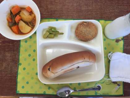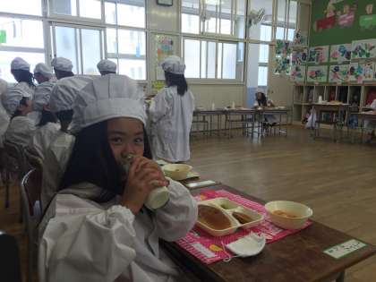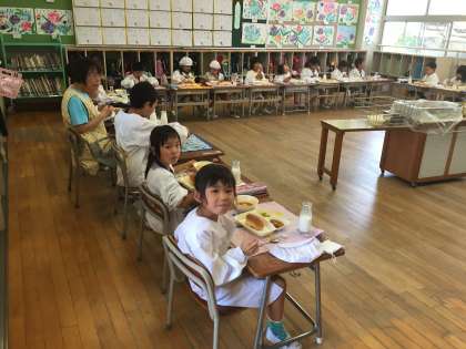 今日は1学期の給食の最終日です。1年生はいつもと机の並べ方を変えて、給食を食べました。献立は、チキンレバーカツ、ケチャップ煮、グリーンアスパラのサラダでした。暑い教室で食べるのも今日が最後となりました。
