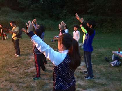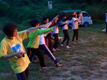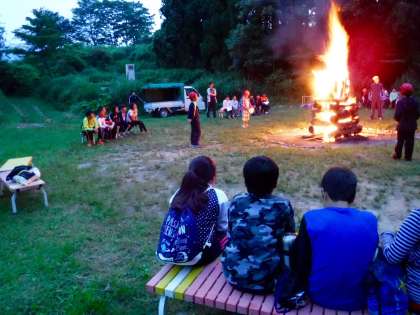キャンプファイヤに火がともると、気分は最高潮です。火の粉を巻き上げ、天まで焦がせ。