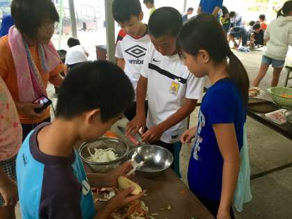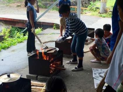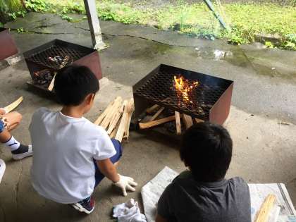 飯ごう炊さんでカレー作りをしました。火をつける係と食材を切る係に分かれて活動をしました。マキが湿気を含んでいるので、火起こしに苦労していました。