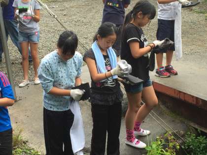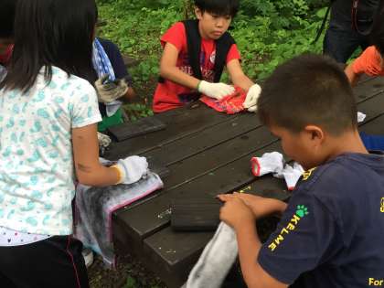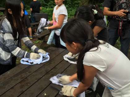 焼き板を磨いて光沢を出します。木目がきれいに見えるまで、タオルで擦ります。