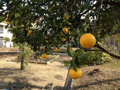 校内は木々がたくさん植えられていますが、中には実を結ぶものもあります。以前は、カリンの木を紹介いたしました。それ以外にビワやキンカンがあり、柑橘系のものが多いです。管理作業員さんが、折々に採取して受付に飾ってくれています。
