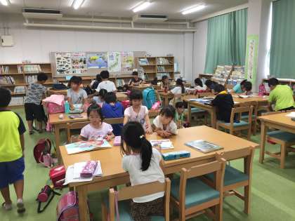 放課後の学習や読書時間として図書館で開いている「ひかりホッとルーム」。子どもたちにはすっかり定着して、たくさんの子がやってきます。みんなよく勉強しています。