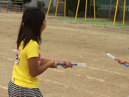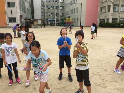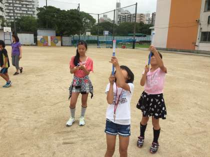 圧縮された空気の力を学習をする「空気てっぽう」。後玉を棒で押すと、前玉が勢いよく筒から飛び出します。4年生が楽しそうに、理科の学習をしていました。