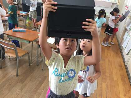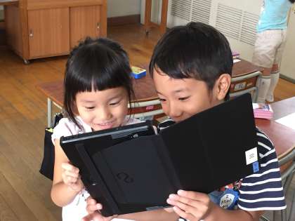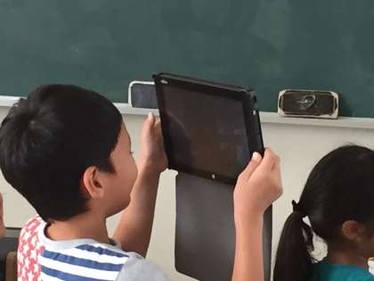 1年生はタブレット端末を手にしても平気です。自分たちでどんどん使います。写真を撮るなんて、簡単でした。