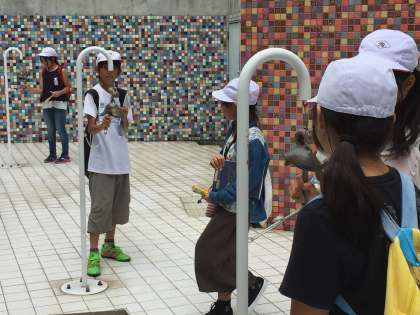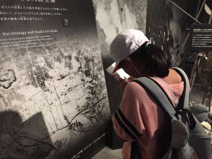 戦争の悲惨さをいろいろな資料をもとに学びました。「刻の庭」に置かれている鐘をたたきながら、平和の尊さを胸に刻んでいました。
