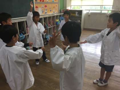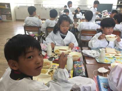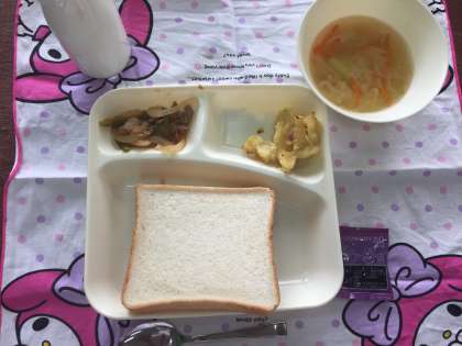 今日の給食は、豚肉と野菜のケチャップソテー、スープ、スィートポテトでした。食欲旺盛な子たちは、おかわりをジャンケンで決めていました。