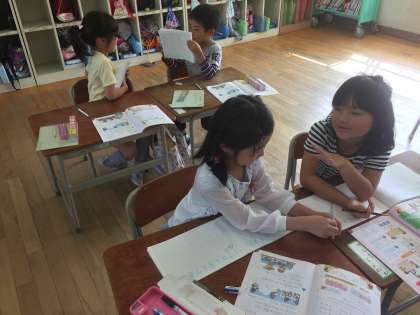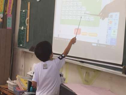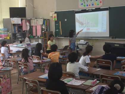 子どもたちにわかりやすい授業にしていくために、本校ではデジタル教科書を積極的に活用しています。1年生も楽しそうに発表していました。