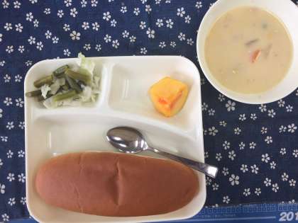 今日の給食は、コーンクリームシチュー(米粉)、キャベツと三度豆のサラダ、柿でした。デザートの柿を食べていると、季節を感じました。