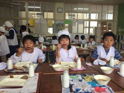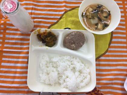 今日の給食は、和風おろしハンバーグ、みそ汁、かぼちゃのいとこ煮でした。かぼちゃの煮物の中にあずきが入っていて、甘くておいしかったです。