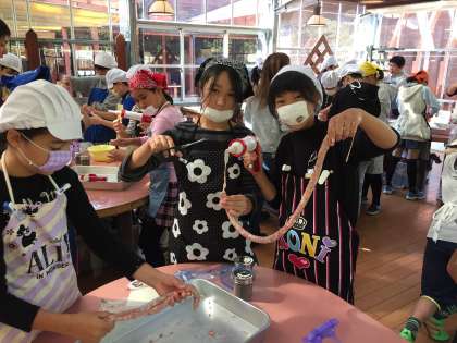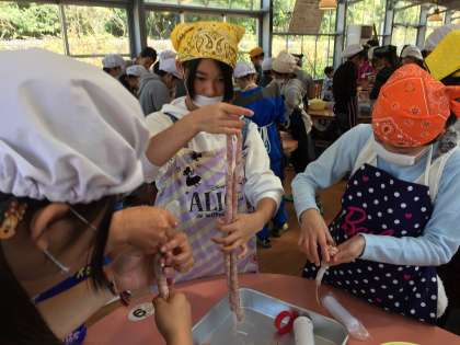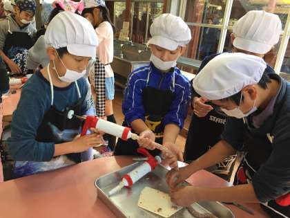 腸詰め作業を体験しました。上手に協力してウィンナーづくりをしました。