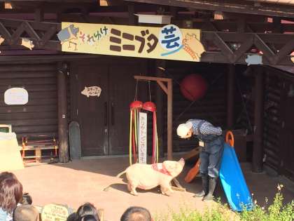 かわいいミニぶたが芸を見せてくれました。あたたかくて、のんびりとした時間を過ごしています。