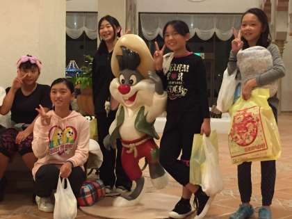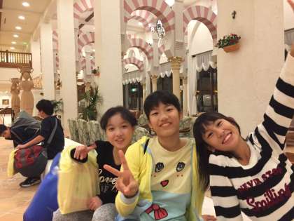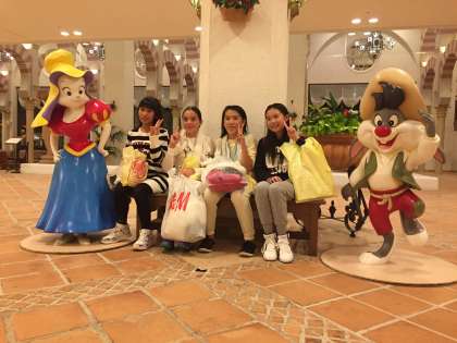 お買い物を済ませてホテルのロビーでくつろいでいます。これから反省会をして就寝の準備をします。