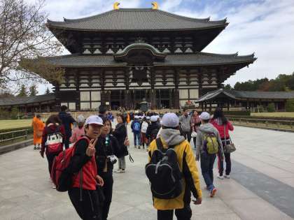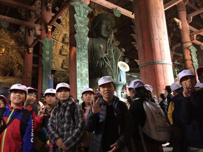 東大寺大仏殿に入り、大仏様を見学しました。初めて見た感想は、みんな同じで「大きいな」「どうやってつくったんやろ」です。それが6年生になった時の学習につながります。