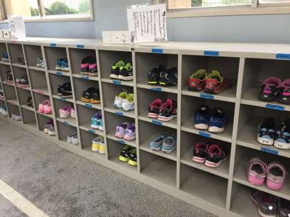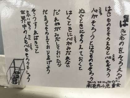 児童会が「はきものをそろえよう」と呼びかけています。そして各クラスのくつ箱の前には、貼り紙をしてくれました。くつをきちんとそろえて脱ぐという習慣は、すべてに通じることです。とてもすばらしい取り組みをしてくれています。