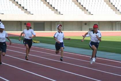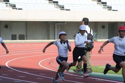昼食後はヤンマースタジアム長居に会場を移動して、陸上競技を行いました。50m走、100m走、と400mリレーです。ここでも光小の快走が見られました。