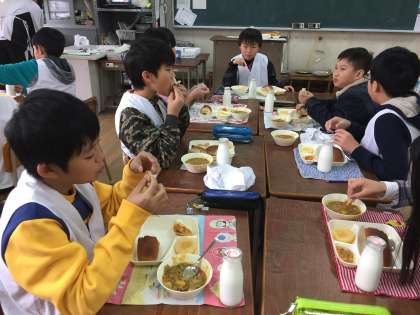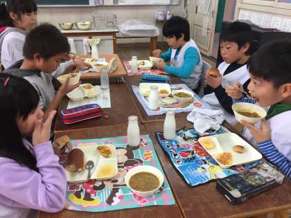 今日は豚肉と大根のカレー煮、変わりピザ、白桃でした。カレーライスみたいに、パンにカレーをつけて食べている子がいました。
