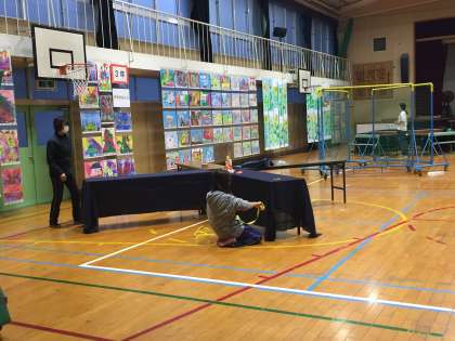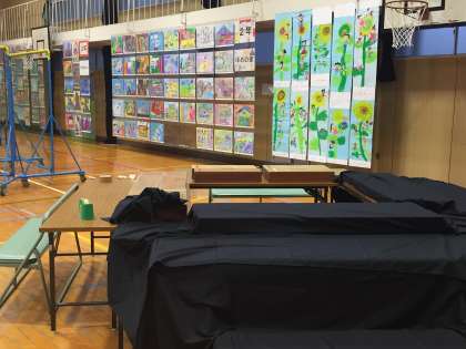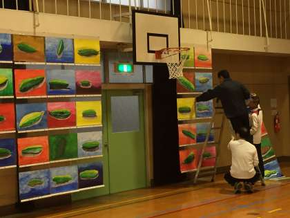 学校では、夜おそくまで作品展の会場作りを行っています。子どもたちの作品を際立たせるのは、展示の仕方です。各学年とも色々な工夫をしています。