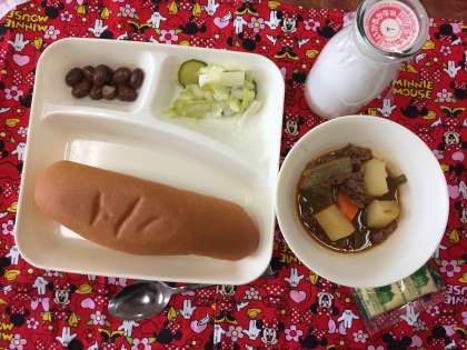 今日の給食は、牛肉と野菜の洋風煮、キャベツときゅうりのサラダ、うずら豆のグラッセでした。具材がたっぷりの洋風煮は、あったかくておいしかったです。