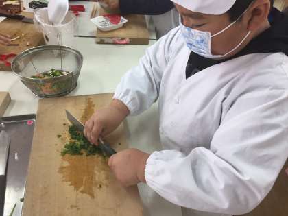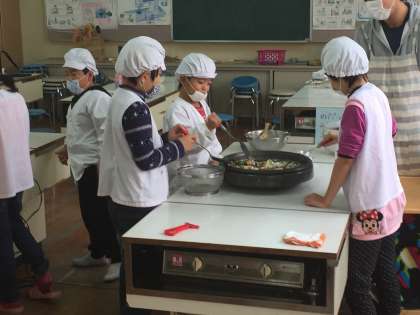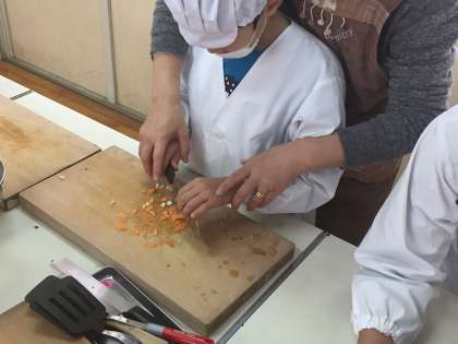 ひまわり学級のみんなが集まって調理実習をしました。今日はチャーハンとさつまいものフライを作りました。1年生の子も包丁をつかって食材を切ります。みんなとても上手にできます。とてもおいしくでき上がりました。