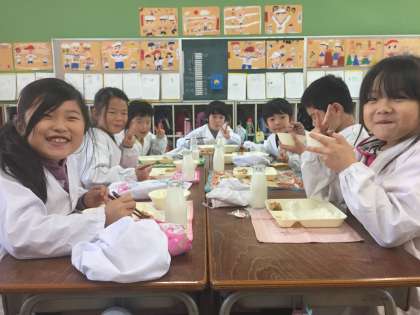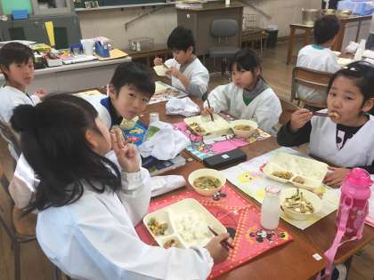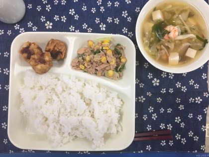 今日の給食は、あげシューマイ、えびととうふのスープ、ツナとチンゲンサイの炒めものでした。えびととうふのスープであったまりました。