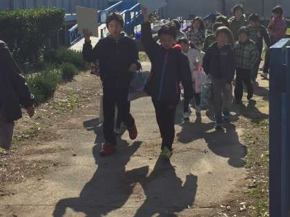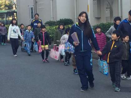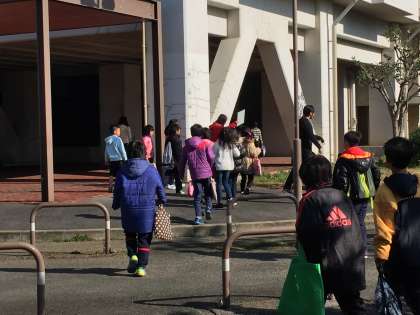 緊急時に下校する場合は、教員の引率のもとでの集団下校になります。これも何度も実施することで、すばやく棟別に集結できるようになっています。今回は、ひかりの団地の班は、東門よりの下校を試みました。場合によっては、この東門より下校することも考えています。