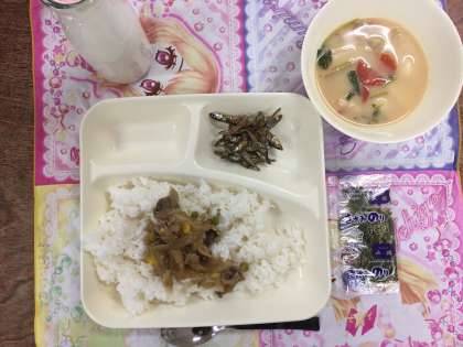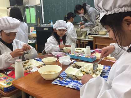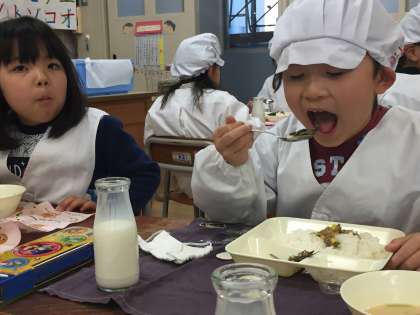 今日の給食は、正月の行事献立で、きんぴらちらし、ぞう煮、ごまめでした。久しぶりに食べるごまめやぞう煮を、おいしそうに食べていました。