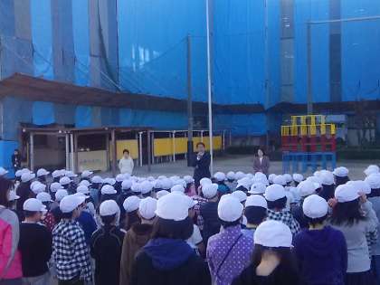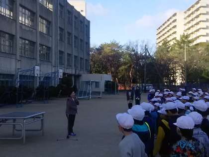 きりっとした寒さのなか、全校朝会をしました。「阪神淡路大震災の朝も今朝のような空気でした」という校長先生のお話でした。防災について考える一週間にしたいですね。また、新しく来られた松尾先生の紹介もありました。