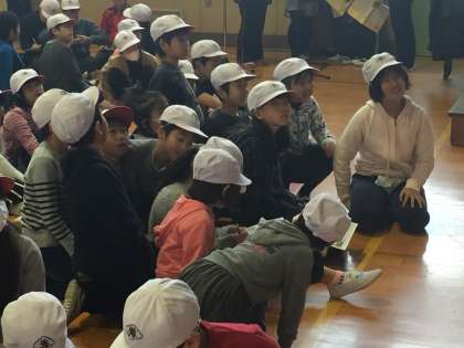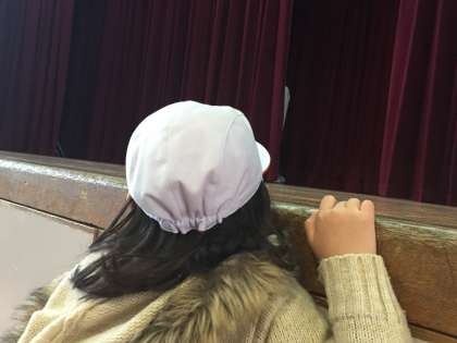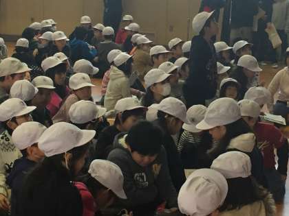 児童集会で、舞台上の幕の間を通り過ぎるものを当てるゲームをしました。どんなものが出てくるのか、興味津々でした。