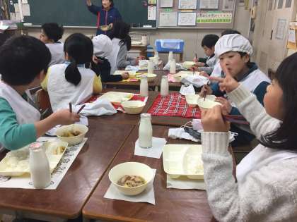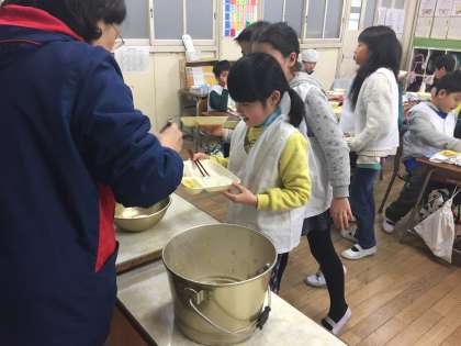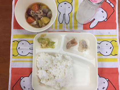 今日の給食は、さつまいもと豚肉の甘辛煮、れんこんの米粉天ぷら、キャベツのおひたしでした。平成27年度の学校給食献立コンクールの優秀賞献立だそうです。れんこんがカラッと揚がっていて、サクサクでした。