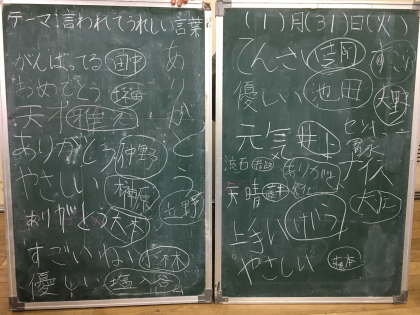 5年生では、自分の気持ち、なりたい姿、友だちから言われたい言葉などを小黒板に書いています。また、自分からすすんで友だちへの「ほめ言葉」を画用紙に書いて掲示しています。心の中で思っているだけでは、はっきりとしないことを黒板に書き出し、お互いに見合うことで、自分の気持ちがはっきりとしたものになります。まだまだ、具体的なものになっていませんが、6年生としての1年間、最高学年としての自覚と期待をふくらませています。とてもすばらしいことです。